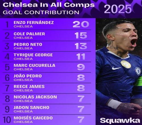 本场比赛埃斯特旺首发登场表现出色,打进一球,8次射门3次射正,还有2次关键传球,他也当选切尔西官方评选出的本场比赛队内最佳球员。 此外,埃斯特旺对阵阿贾克斯进攻三区触球63次,创造本赛季欧冠纪录。 消息来源:欧冠官网 3 - 切尔西制造机会数对比 数据网站Squawka盘点了2025年切尔西球员各项赛事参与进球榜单,具体如下(进球+助攻):