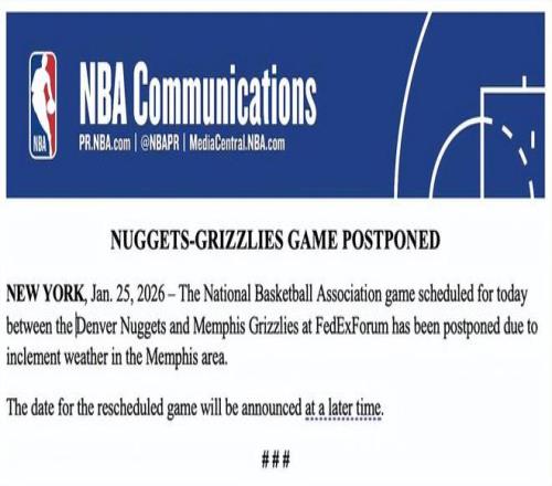 北京时间1月26日,受席卷全美大部地区的强冬季风暴影响,原定于今日进行的掘金vs灰熊以及独行侠vs雄鹿的NBA常规赛都宣告推迟,比赛的补赛日期将另行公布。