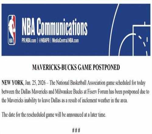 NBA官方:掘金vs灰熊、独行侠vs雄鹿均因恶劣天气原因延期进行